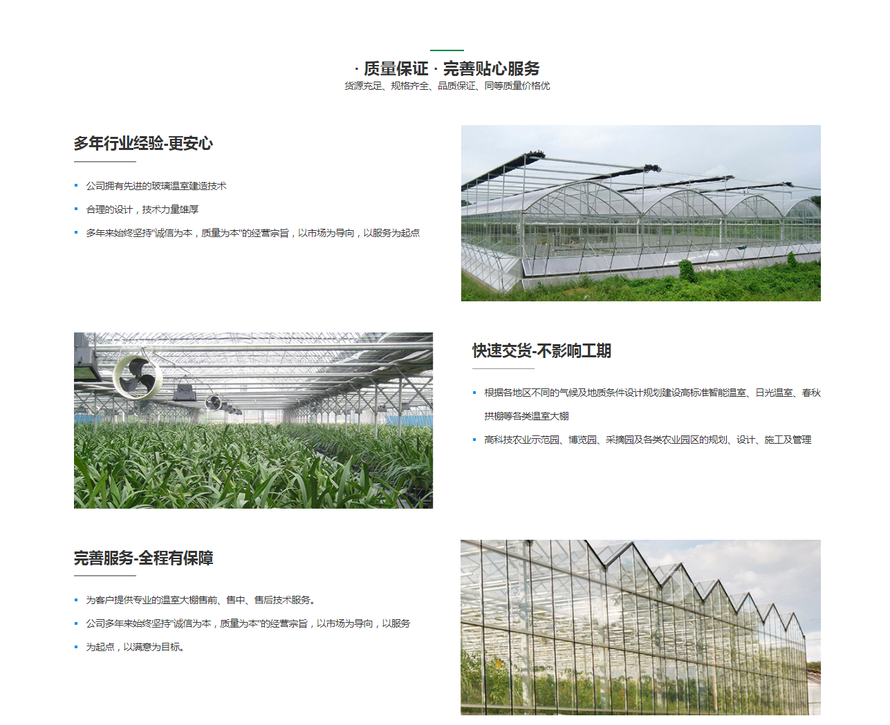 無錫永睿鴻溫室工程有限公司自創辦以來,已在多個城市地區承建了許多的農業示范園區、花卉苗木種植園、家禽水產養殖區、生態餐廳和旅游觀光園等。并以“質量過硬、價格合理、服務周到”贏得了廣大用戶的信賴?! 」局鳡I產品:玻璃溫室、溫室工程、連棟大棚、蔬菜大棚、溫室大棚、花卉大棚、養殖大棚、大棚鋼管、外遮陽大棚、外遮陽連棟大棚等。  公司產品廣泛用于農業生產、水產養殖、食用菌培養、花卉生產、林業種苗、畜牧等行業,并配有各種規格可供選擇,還可根據客戶要求提供特制結構。  我公司擁有豐富的施工經驗和完善的售后服務,秉承著團隊精神的和始終堅持誠信做人、認真做事、科學管理,不斷開拓創新,超越自我,提升綜合素質的理念,同時公司擁有技術精湛,經驗豐富的技術團隊,將竭誠為各界朋友提供農業設施的設計及相關服務?! 」疽回瀳猿帧捌焚|保證、用戶至上,誠信服務”的宗旨,憑借著高質量的產品,良好的信譽,完善的服務,產品暢銷近三十多個省、市、自治區。歡迎來電咨詢!  Since its establishment, Wuxi yongruihong Greenhouse Engineering Co., Ltd. has undertaken to build many agricultural demonstration...